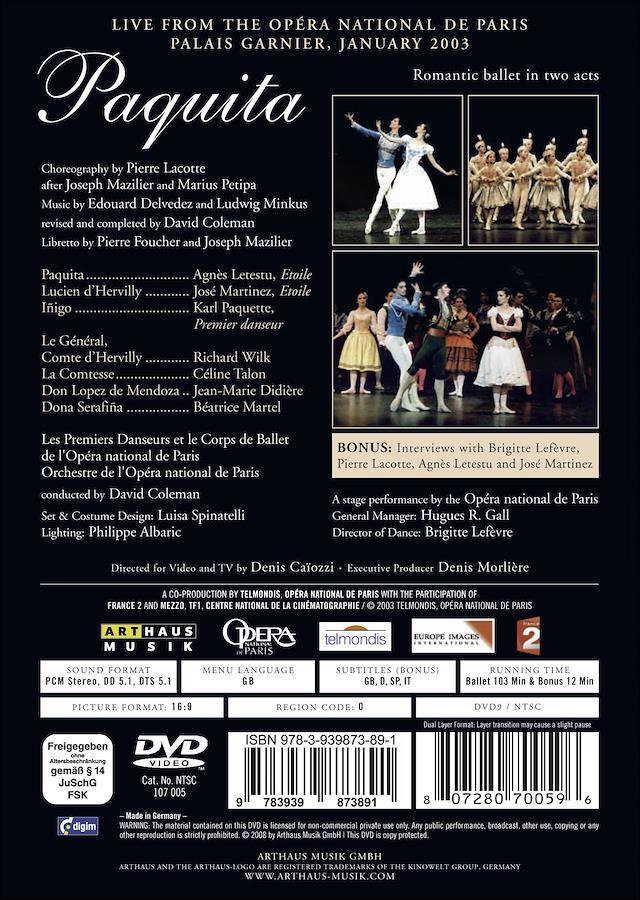 パリ・オペラ座バレエ「パキータ」(全2幕) 【出演】 アニエス・ルテステュ(パキータ) ジョゼ・マルティネズ(リュシアン) カール・パケット(イニゴ) 【振付】 ピエール・ラコット (原振付:ジョゼフ・マジリエ & マリウス・プティパ) 【音楽】 エドゥアール・デルデヴェス ルードヴィヒ・ミンクス 【演奏】 パリ・オペラ座管弦楽団 指揮:デヴィッド・コールマン 【収録】 2003年1月 パリ・オペラ座 ガルニエ宮 【収録時間】 本編103分 + 特典映像12分 = 計115分 ※インポート商品(並行輸入品)/日本語字幕なし