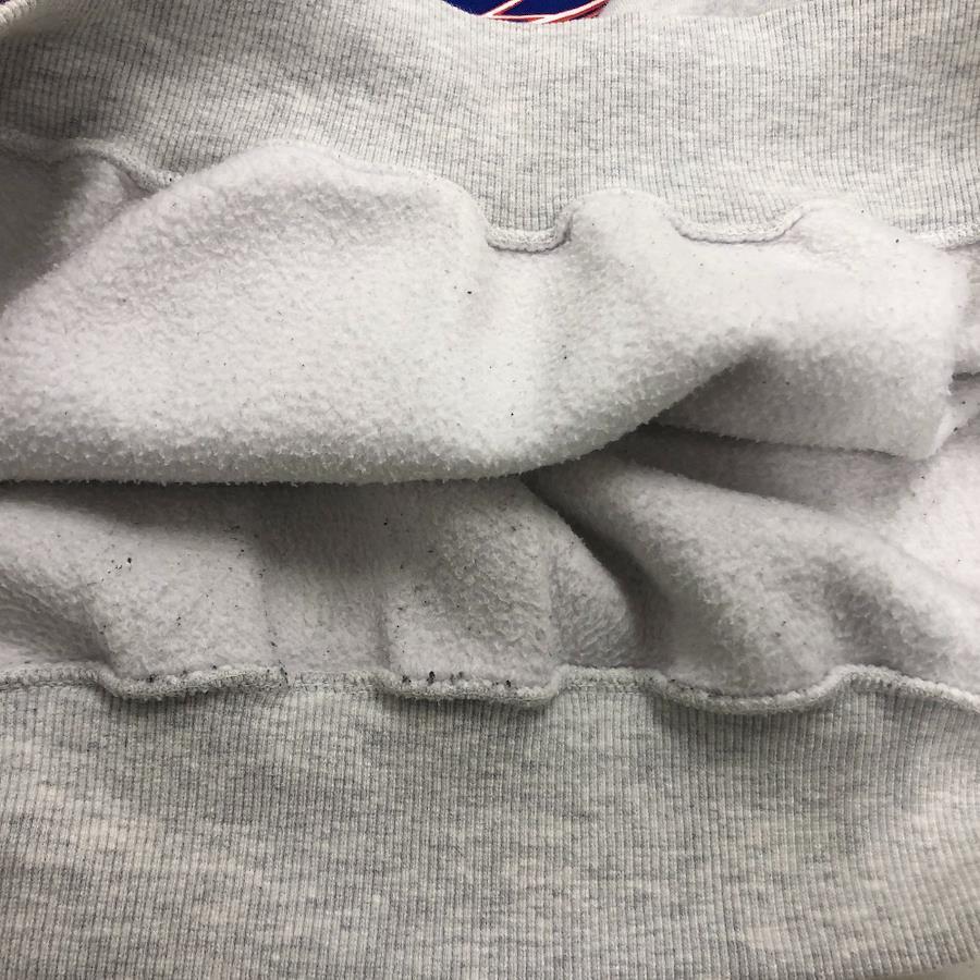 首周りや袖口、裾などに汚れやヨレが見られます。