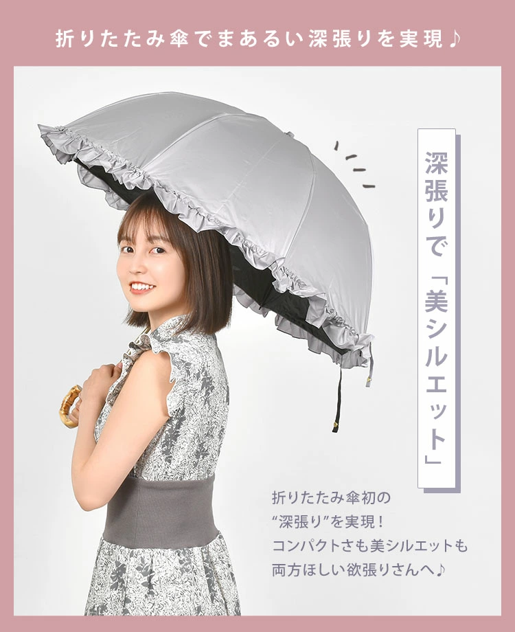 ブラックコーティングが照り返しも吸収し、紫外線・赤外線・可視光線も最大限カット!涼しく快適で、熱中症対策にも◎折りたたみ傘 "初" 深張りシルエットを実現☆折りたためるコンパクトさと、美しいシルエット、どちらも欲しい欲張りさんにおすすめです◎晴雨兼用で突然の雨にも対応!これ1本で、晴れの日も雨の日も毎日使えます◎さらに、伸ばした状態でも持ち運べるようになりました!外側にもベルトを付けたことで折りたたまず、伸ばした状態で束ねれます。