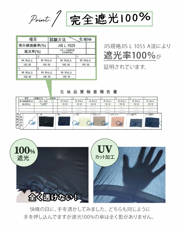 ■仕様・完全遮光100%・UVカット99.9%以上・内側ブラックコーティング・晴雨兼用・はっ水度:4~5級・ネイルガード・グラスファイバー骨使用