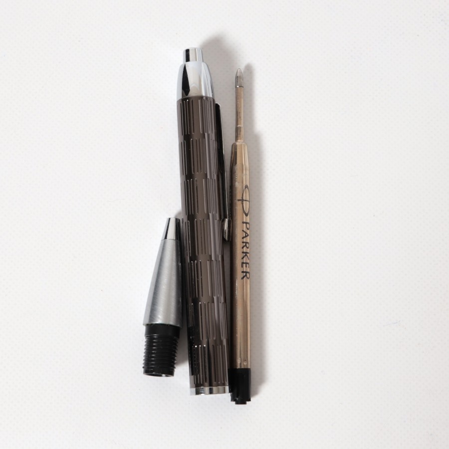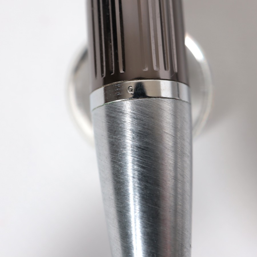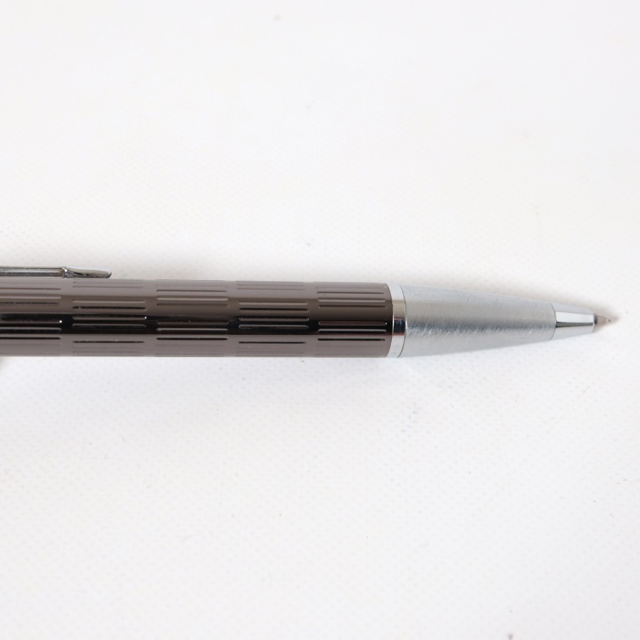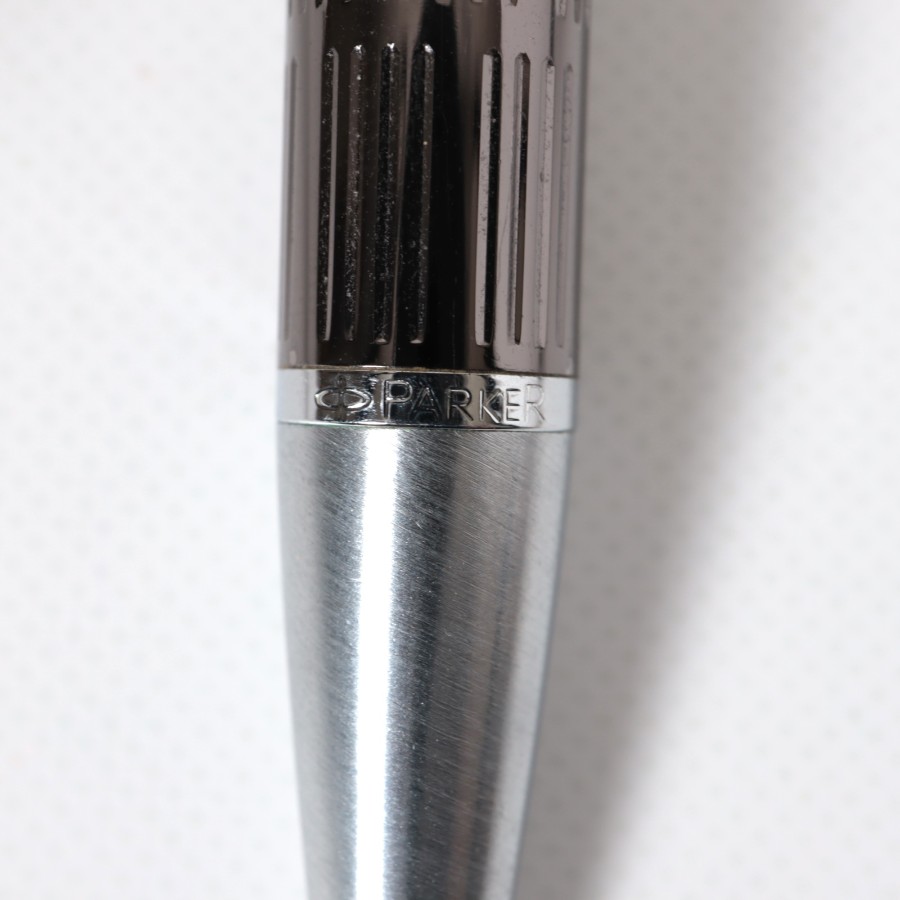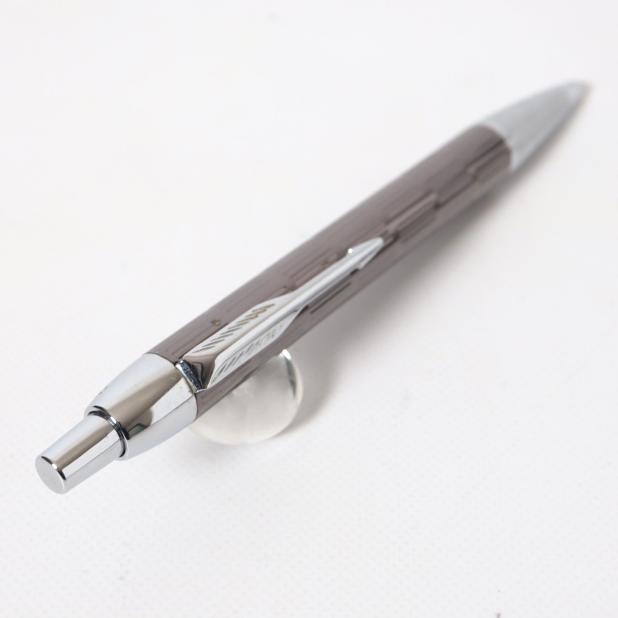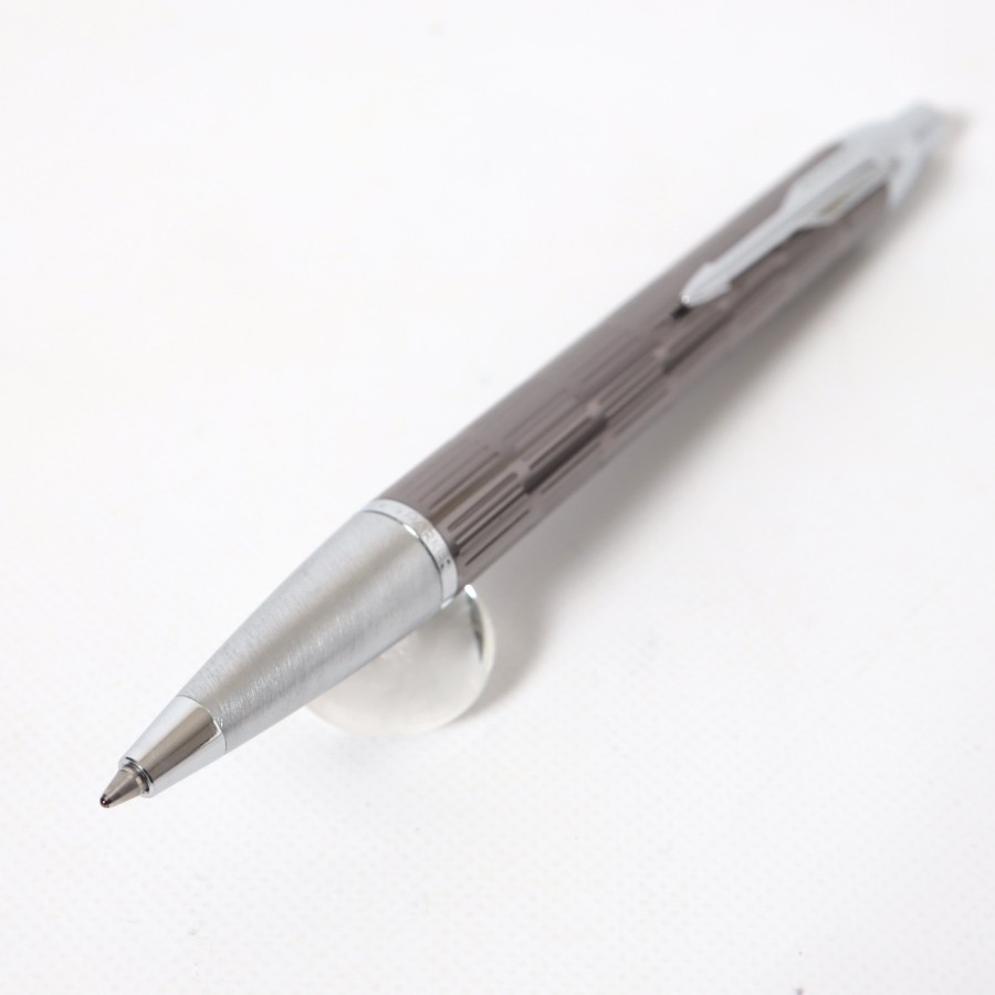パーカーの「IM プレミアム カスタムチーゼルCT」ボールペンです。洗練されたシルバーのボディに施された緻密な格子状の彫刻が、手に取るたびに確かな充足感を与えます。