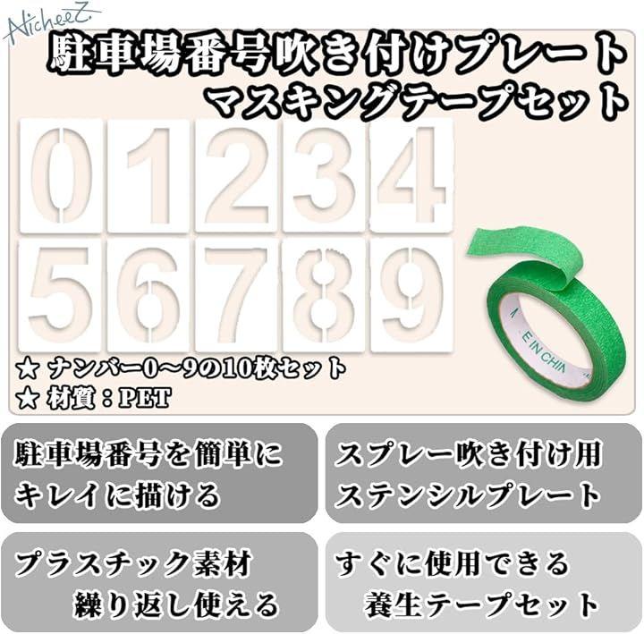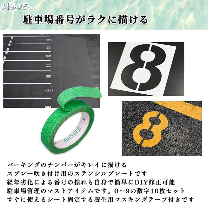 0~9の数字10枚セット、すぐに使えるシート固定する養生用マスキングテープ付きです。