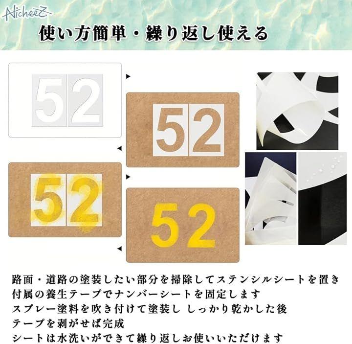 「使い方簡単・繰り返し使える」路面・道路の塗装したい部分を掃除してステンシルシートを置き、付属の養生テープでナンバーシートを固定します。