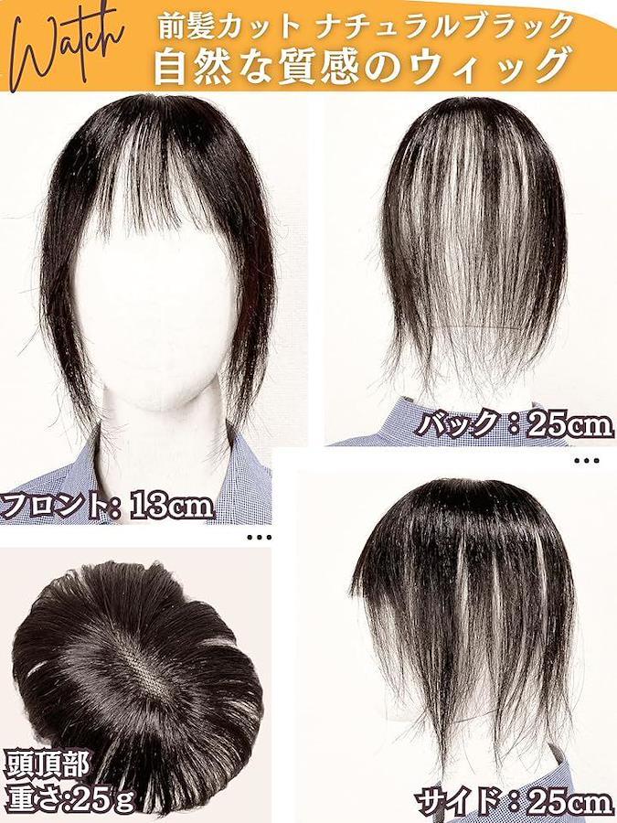 「商品詳細」(3)サイズ:ベース 縦8x6cm (4)重さ:約14g (5)カラー:ナチュラルブラック (6)デザイン: 前髪カット フロント13cm バック25cm サイド25cm (7)用途: うぃっぐ 部分ウィッグ かつら 中高年 ハゲ隠し
