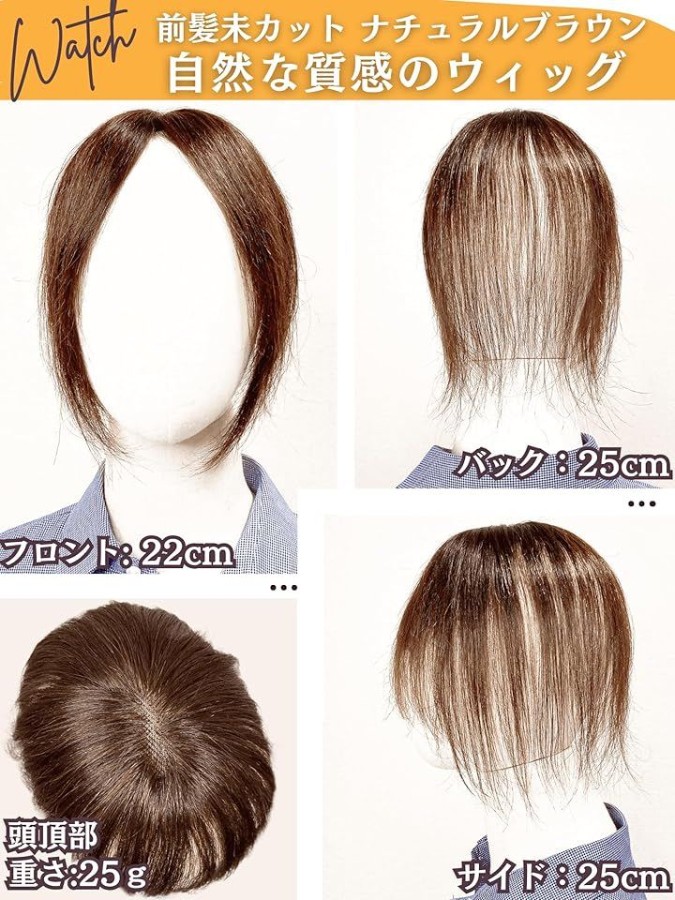 「商品詳細」(3)サイズ:ベース 縦8x6cm (4)重さ:約14g (5)カラー:ナチュラルブラック (6)デザイン: 前髪カット フロント13cm バック25cm サイド25cm (7)用途: うぃっぐ 部分ウィッグ かつら 中高年 ハゲ隠し