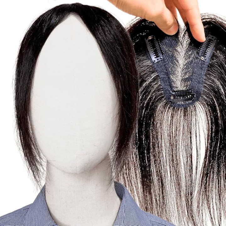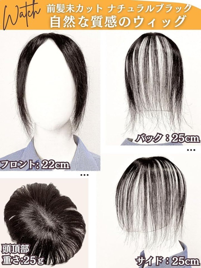「商品詳細」(3)サイズ:ベース 縦8x6cm (4)重さ:約14g (5)カラー:ナチュラルブラック (6)デザイン: 前髪カット フロント13cm バック25cm サイド25cm (7)用途: うぃっぐ 部分ウィッグ かつら 中高年 ハゲ隠し