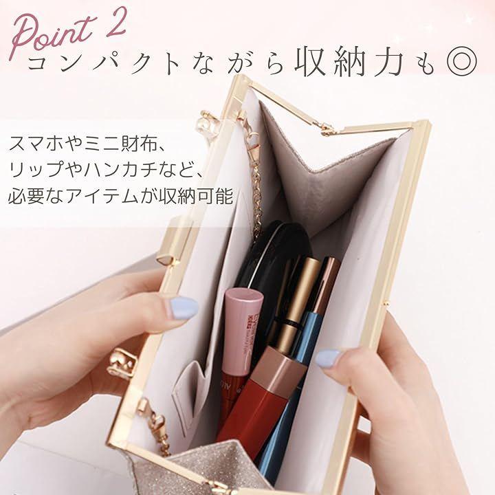 コンパクトながらもスマホ・ミニ財布・ハンカチなど必要なアイテムがしっかり収まり、結婚式・披露宴・二次会・謝恩会など、あらゆるフォーマルシーンに最適です。
