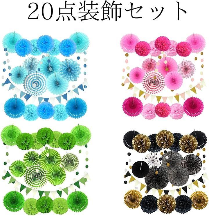20点セットでパーティー会場を華やかに演出 ペーパーファン、ポンポン、紙花、ガーランドなど、豊富なアイテムで一度に豪華な飾り付けが完成します。