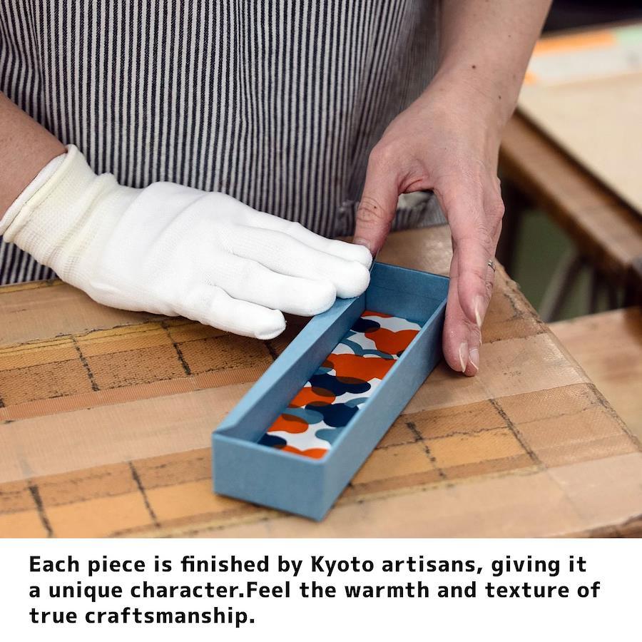 本商品に使用している和紙は、京都の職人が一枚ずつ手染めで仕上げています。そのため、まれに白い点やわずかな色ムラが見られることがございます。