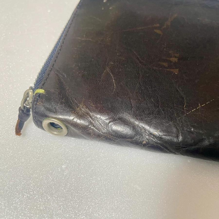 - 色: ダークブラウン- 内側の色: グリーン- 収納ポケット: カードポケット、ファスナー付きポケット、オープンポケット- 特徴: レザー製、ジッパー開閉- 状態: 使用感あり、傷あり