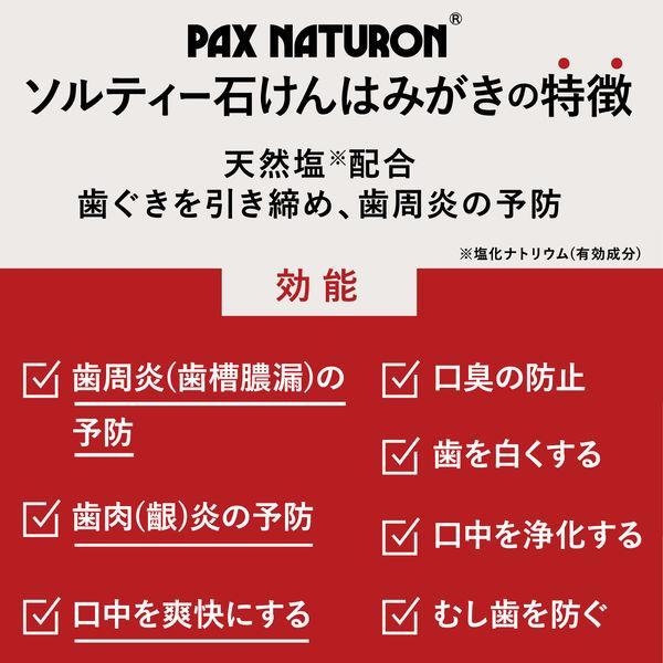 100%自然由来成分!天然塩(塩化ナトリウム(有効成分))配合で、歯ぐきを引き締め、歯周炎の予防します。●石油由来原料・合成界面活性剤・鉱物油・合成ポリマー・水酸化アルミニウム・合成防腐剤・合成香料・合成着色料・プロピレングリコール・サッカリンはすべて無添加です。●磨いた後も味がわかる!石けん成分は口腔内の粘膜や舌(味蕾)に吸着しにくく、口をゆすぐとサッと洗い流せるので、はみがきの直後に飲食しても後味に違和感が残りません。
