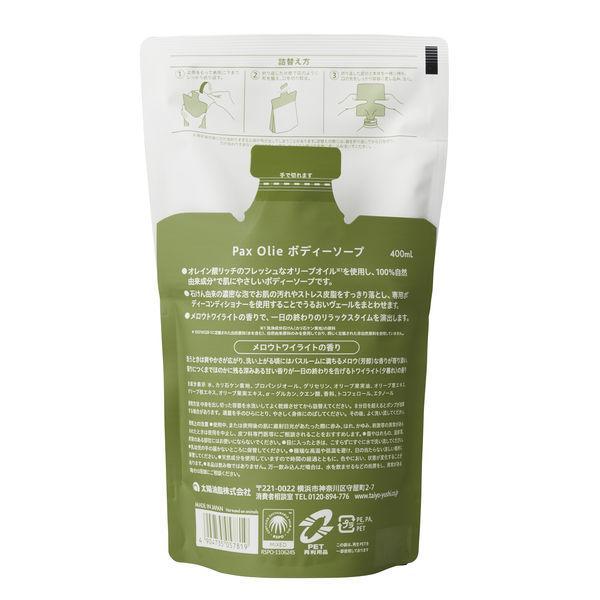 泡で出てくる、100%自然由来成分の石けんボディーソープです。オリーブ油を使用した石けんの濃密な泡が、地肌の古い皮脂や汚れをしっかり取り除きます。●身体を洗う時、バスタイム後にリビングでくつろぐ時。パックスオリーシリーズは時間の経過によって香りの表情が変わります。この、香りの旅を意味する「フレグランスジャーニー」が、より豊かなリラックスタイムを演出します。●食用のヴァージンオリーブオイルを精製し、不純物を取り除きました。さらにポリフェノールを含むオリーブの葉・枝のエキスを配合することで、地肌や肌を整え健やかな状態を保ちます。●オレイン酸リッチのフレッシュなオリーブオイルを使用。●石けん由来の濃密な泡でお肌の汚れやストレス皮脂をすっきり落とす。●パックスオリーボディーコンディショナーとセットで使用することで、うるおいヴェールをまとわせます。●メロウトワイライトの香りで、一日の終わりのリラックスタイムを演出します。●詰替用です。★メロウトワイライトの香り洗うとき爽やかさが広がり、洗い上がる頃にはバスルームに満ちるメロウ(芳醇)な香りが寄り添い、眠りにつくまでほのかに残る深みある甘い香りが一日の終わりを告げるトワイライト(夕暮れ)の香り。
