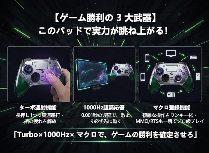 「2. 競技仕様の高性能 | プロ思考の1000Hz&連射機能で勝利に差をつける」 PCコントローラーとして最適化された1000Hz超高ポーリングレートを搭載。