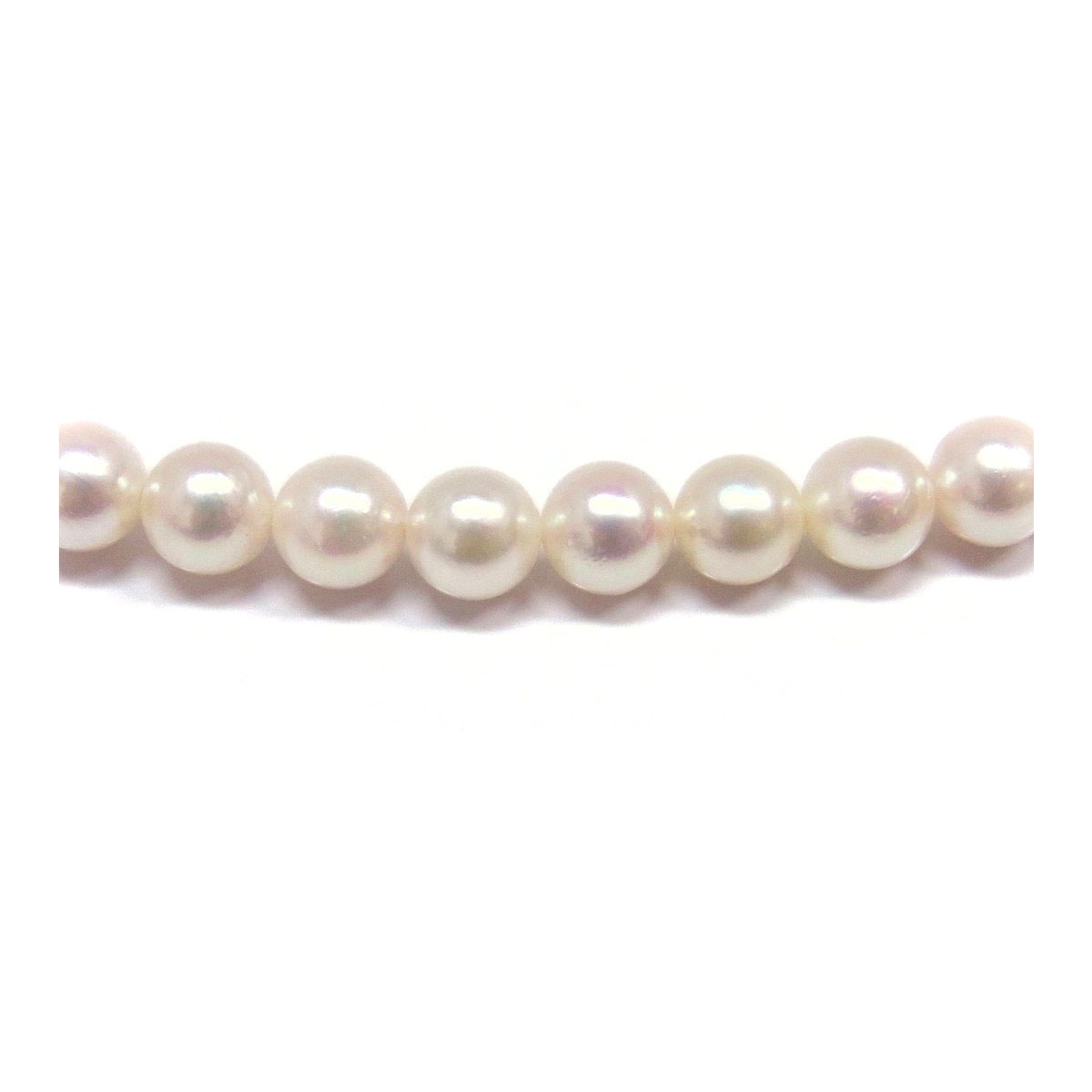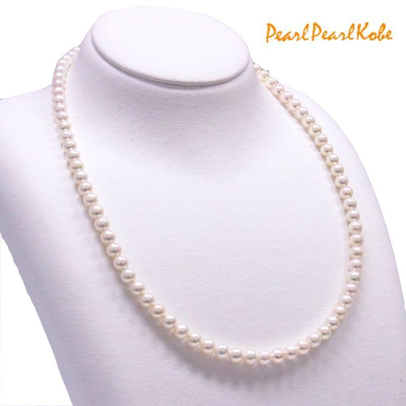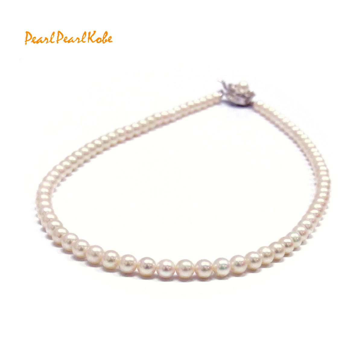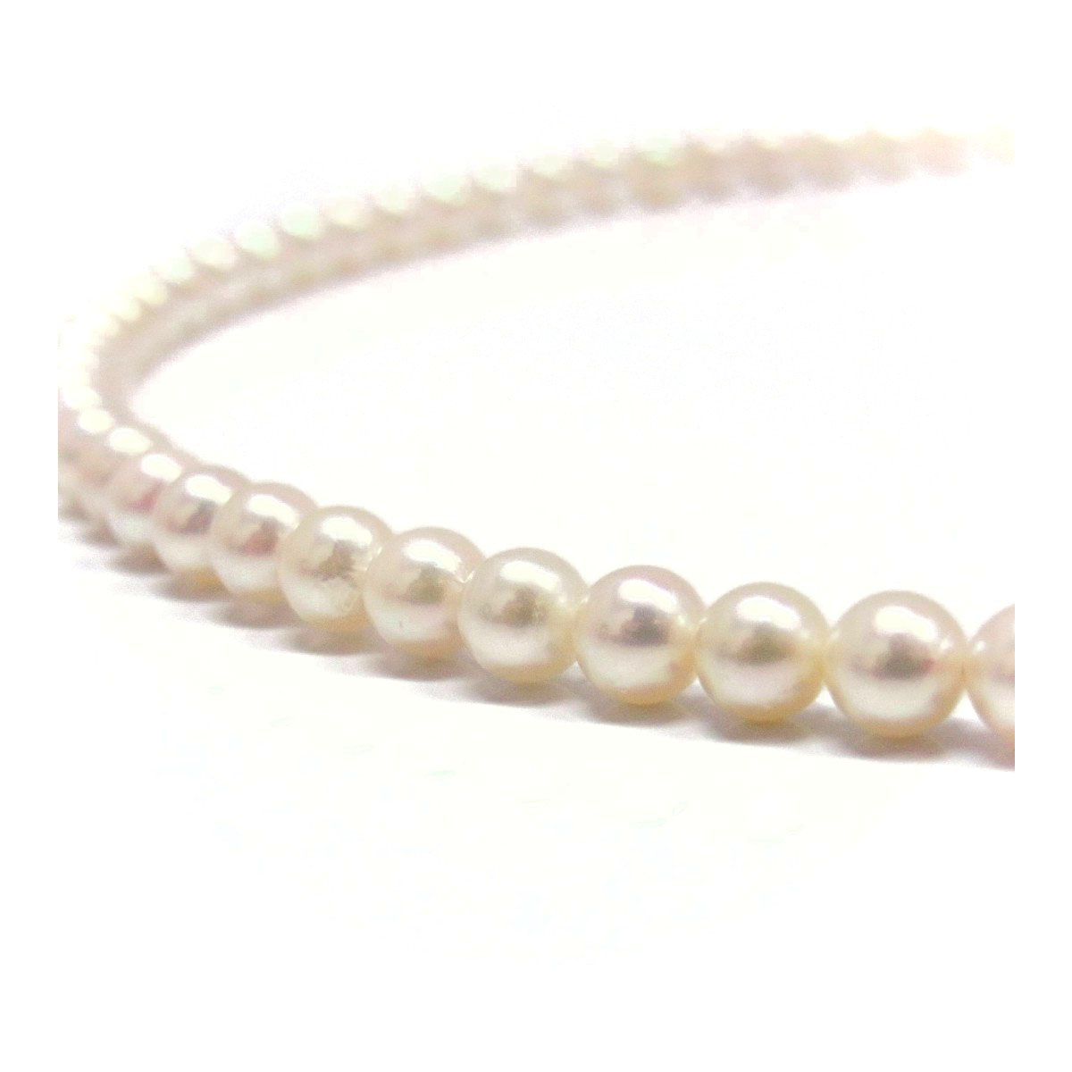 日本産アコヤ真珠ネックレスです。サイズは、少し小さい5-5.5mm.です。近年は生産量が減っていて、希少価値のあるサイズです。フォーマルからカジュアルまで幅広く使えるジュエリーです。