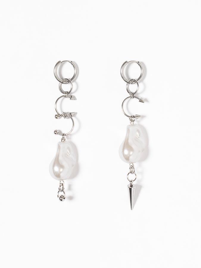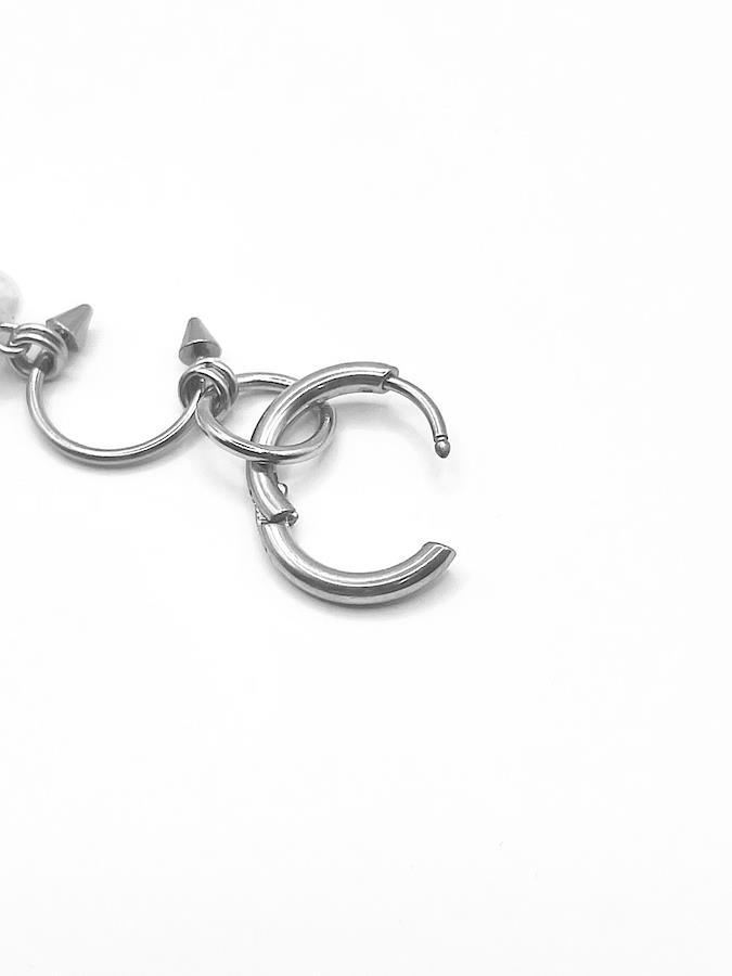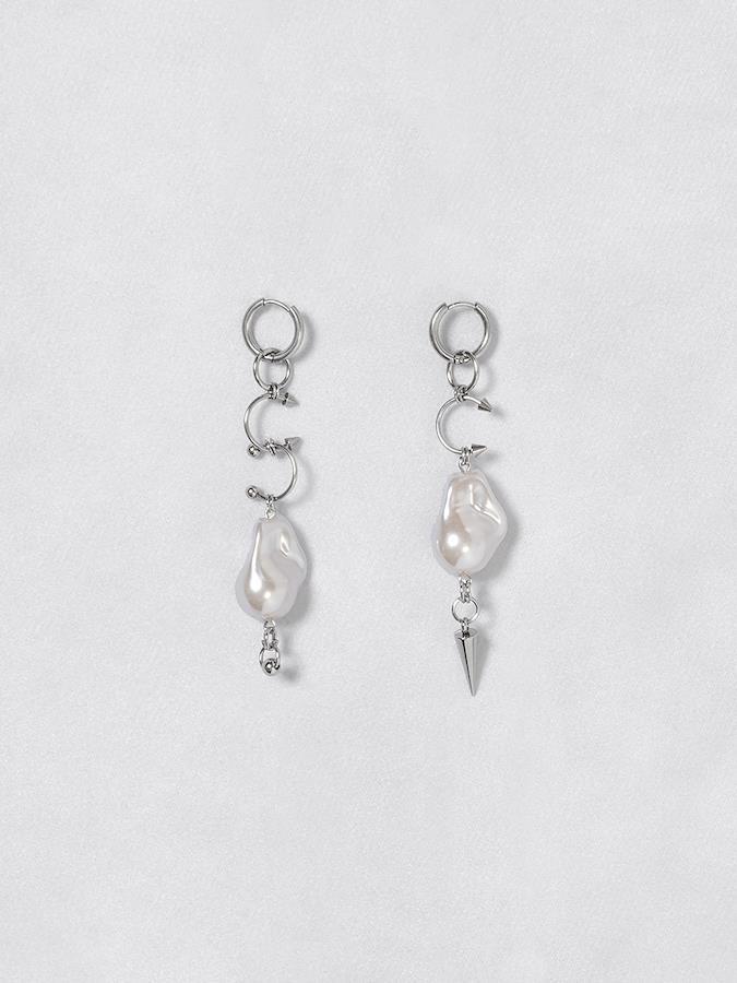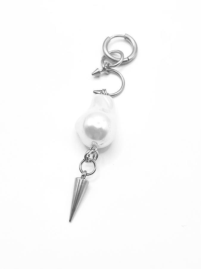 フェイクパールとリベットのピアス。動くたびにゆらゆら揺れる個性的なモチーフで顔まわりのアクセントに♪キャッチ不要のリングタイプでリングの開閉で簡単に着脱できます。※衛生面を考慮し初期不良以外での返品交換不可となりますので予めご了承ください。