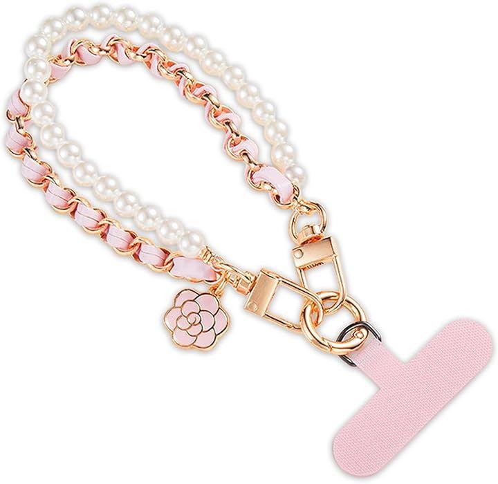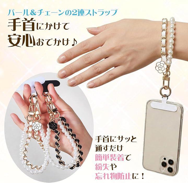 パールの上品さと、合皮編み込みの程よいカジュアル感を組み合わせた 2連デザインのスマホ用ハンドストラップです。
