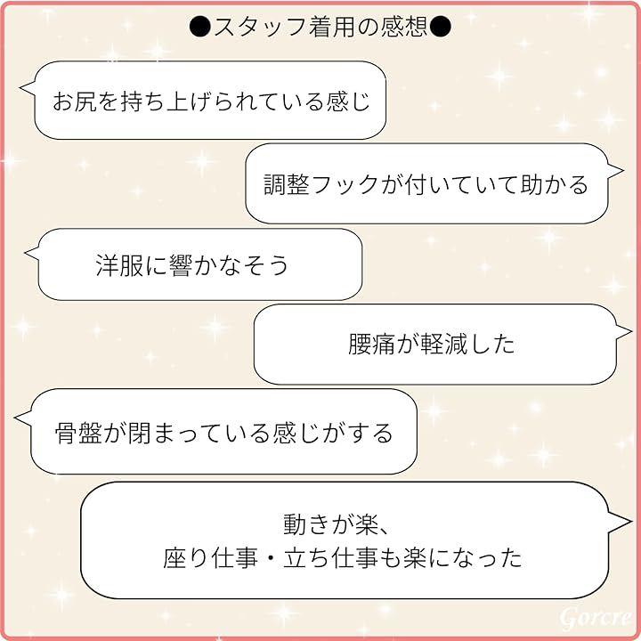 「スタッフ着用してみました」「通気性・フィット感がいい」「調整フックが付いていて助かる」「付けていて洋服に響かなそう」「引き締まってきた感じがする」「仕事中や動きが楽になった」「歩きが軽やか」「お尻を持ち上げられてる感じがする」