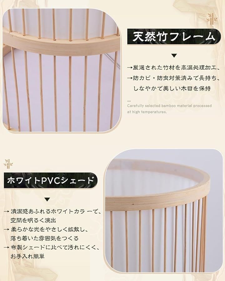 ▶「職人ひとつひとつ手作り」吊り下げライトは高温処理を施した厳選天然竹を使用し、防カビ・防虫対策も万全。