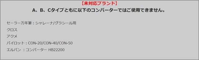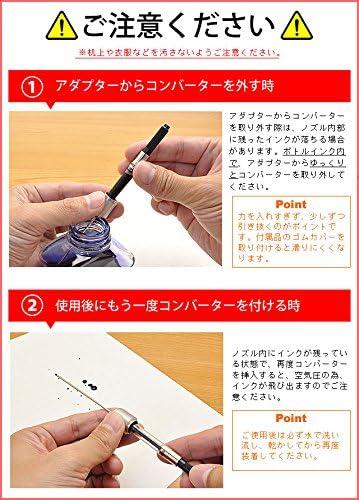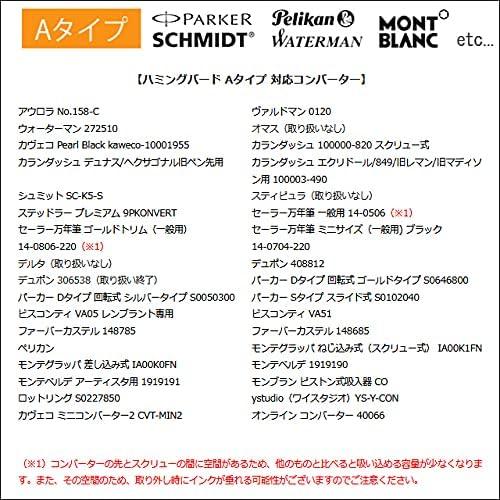 ハミングバードが、花から吸蜜するように、インクボトルから残り少ないインクを無駄なく、吸入!お手持ちのコンバーターに差し込むだけで使用可能。お気に入りのインクを最後の一滴まで使用できる画期的ツールです。 ※初めてご使用される方は、水などで一度試してからご使用ください。 ※コンバーターの種類やその個体差によって容易に入るもの、少し力の要るものもございます。また奥まで挿入しすぎると抜けにくくなる場合がございますのでご注意ください。 <使用上の注意> ・初めてお使いになる際は、アダプター内部の埃などを取り去るため一旦、水を通してください。ご使用されていない予備のコンバーターがありましたら、アダプターに装着し水を出し入れして洗浄していただけますとより一層きれいになります。 ・ご使用後は、アダプターに残ったインクを水で綺麗に洗い流してください。 ・ご使用後、ノズル内にインクが残っていますと、再度コンバーターを挿入する際、空気圧の為、インクが飛び出ますのでお気を付けください。水で洗い流し、乾かしてから装着してください。 ・異なる色のインクにご使用になる場合は、よくインクを洗い流してご使用いただくか、
