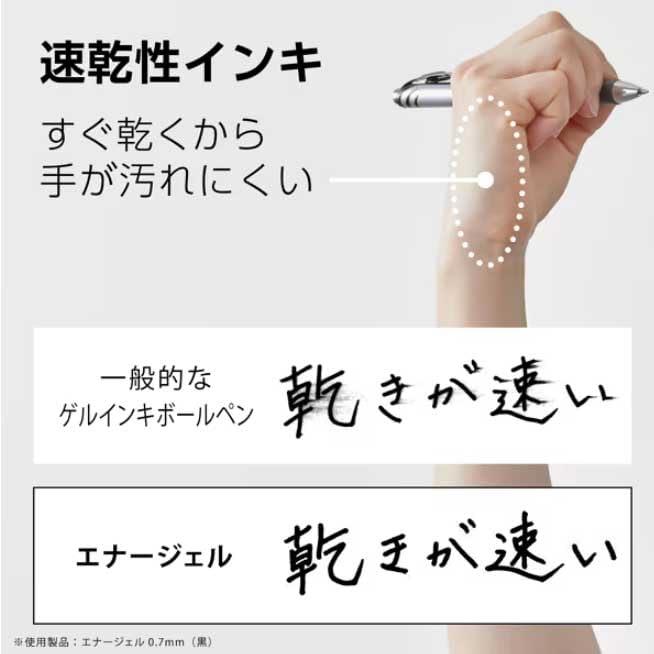 【商品説明】スッと書けて、サッと乾く エナージェルインキ○なめらかな書き心地○筆跡の速乾性○濃く鮮やかな筆跡・高発色の着色剤配合・潤滑剤が従来のゲルインキの3倍※・筆記時の粘度が従来のゲルインキより低い・紙との親和性が高く素早く浸透※当社比、ボール径0.5/0.7において