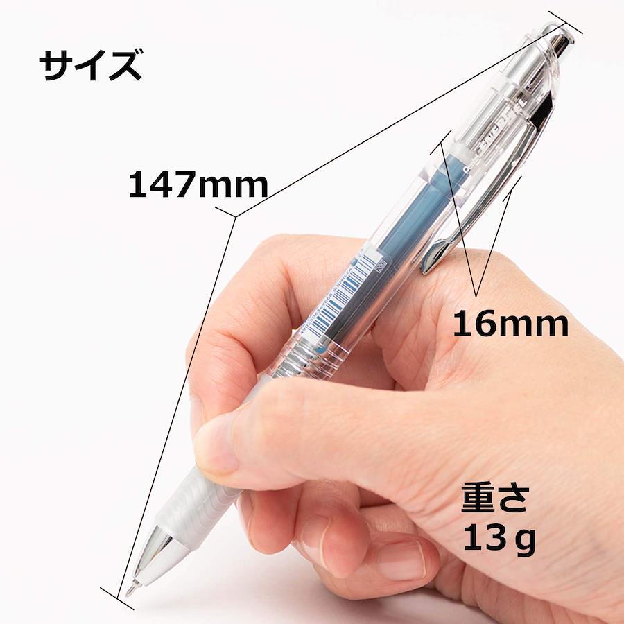 【特徴】スッと書けてサッと乾く。ゲルインキボールペン 軸がクリアでインキがわかりやすい【ボール径】0.4mm 【インク】ブルーブラック【サイズ/重さ】幅 16 ×奥行 11mm × 長さ 147mm/13g【材質】後軸・頭冠=再生PC【材質2】ノック・前軸=ABS樹脂メッキ グリップ=エラストマー クリップ=鉄【免責事項】メーカーによる商品リニューアルに伴いパッケージが変更が行われた場合、新パッケージでお届け致します事ご了承願います。