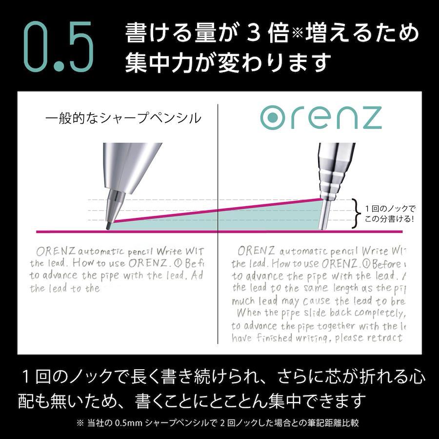先端パイプの分だけ長く書けるため、ノック1回の筆記量が一般的なシャープペンシルの3倍書ける。