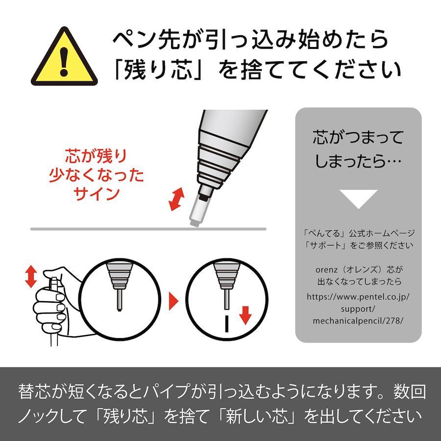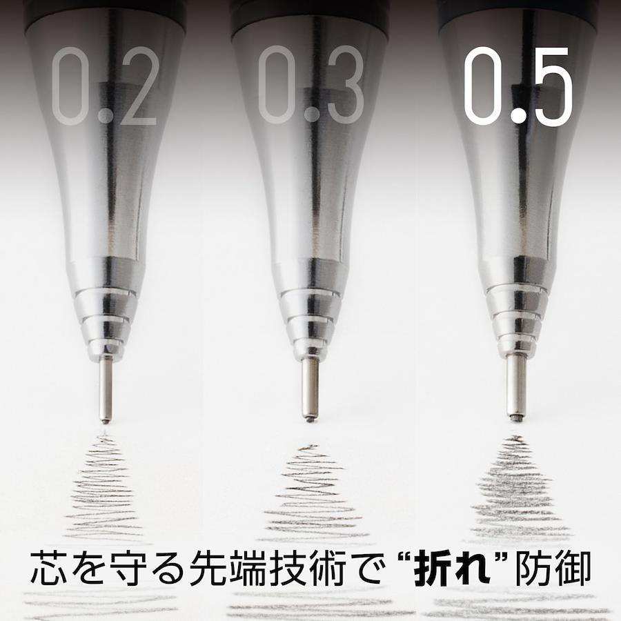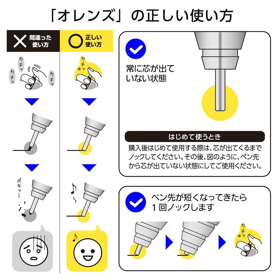 芯を守る秘密、オレンズシステムオレンズシャープペンシルは芯を出さずに書くことで芯を守ります。ペン先が芯の減りに合わせてスライドするので、芯を守ったまま書き続けられます。