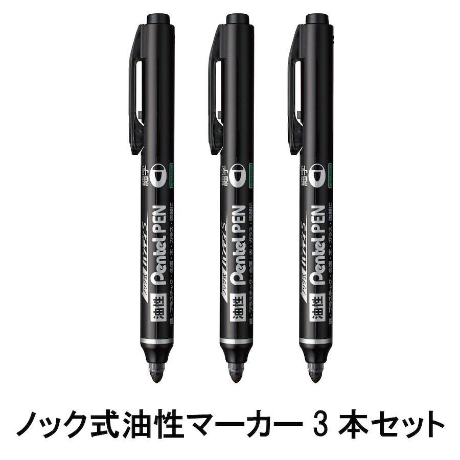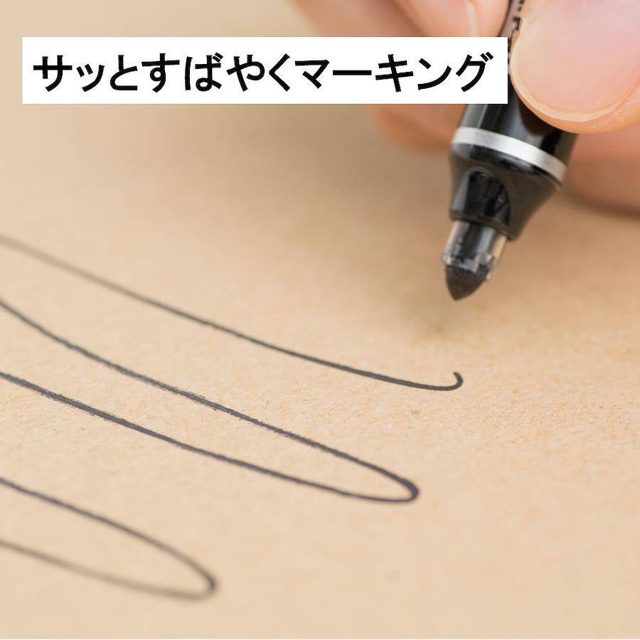 ノック式油性マーカー。サッとすばやくマーキング。ノック式だから、キャップをなくすこともありません。