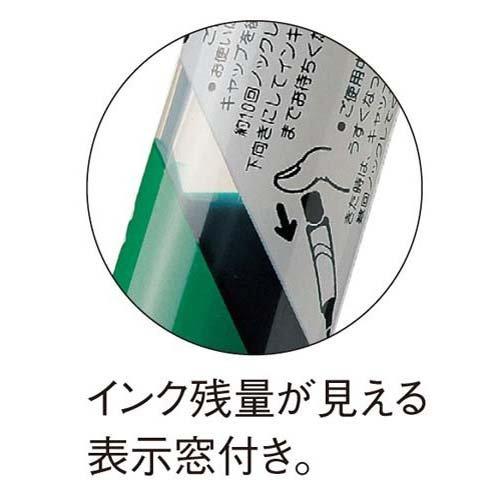 インクが薄くなったら数回プッシュすると濃さが戻り、かすれず鮮やかに書けます。ペン先ではなく後部をプッシュする方式なので、ペン先が傷みにくく、筆跡幅も太くなりません。インク残量が見える表示窓付き。