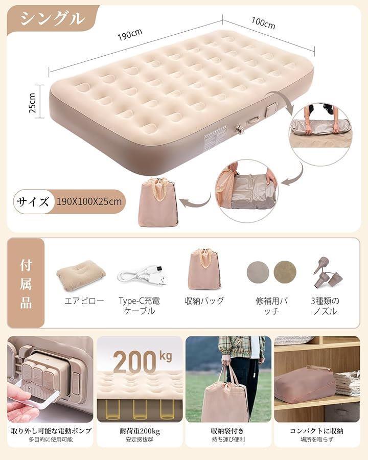 「最新のワイヤレス式・手軽省力」外部電源不要。室内やアウトドアで使える本格的なエアーベッド。市販のエアーベッドを徹底的に研究し、お客様の声を反映した最新改良版。外部電源型エアーベッドは災害やアウトドア時にプラグがなくて不便ですが、内蔵電動ポンプ付きエアーベッドは、ワンボタンで簡単に空気を入れることができます。手間いらずで、快適な寝心地を提供します。
