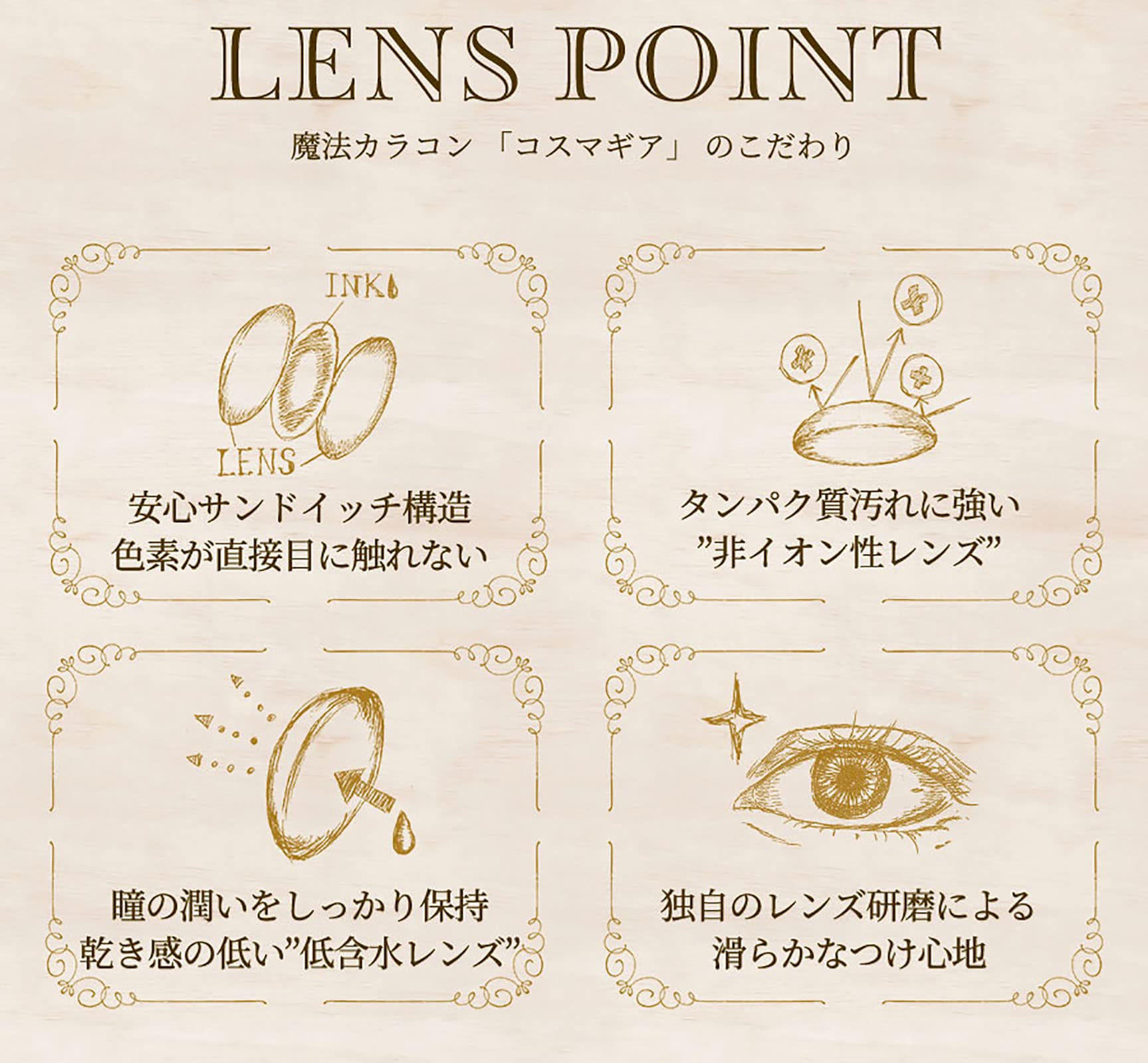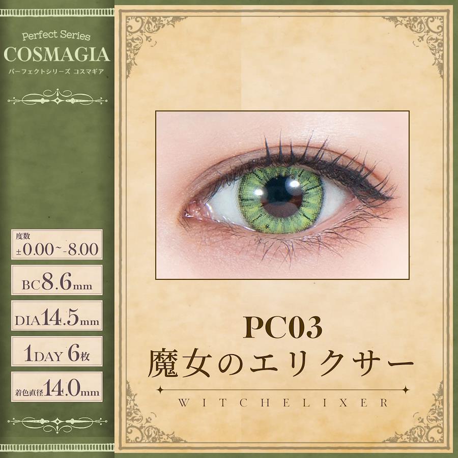 「魔法」をテーマに開発したコスプレカラコンです。 コスプレ 2.5次元舞台 ロリィタファッション 特殊メイク ハロウィン 仮装など様々な場面で瞳に雰囲気と彩りを演出します。 宝石のようにキラめく虹彩デザイン&瞳を優しく強調するぼかしフチ採用 色素が直接目に触れない「サンドイッチ構造」 タンパク質と汚れに強い「非イオン性レンズ」 瞳の潤いを保持。乾きに強い「低含水レンズ」 BC8.6mm/DIA14.5mm/GDIA14.0mm/1箱6枚(ワンデー) 【PC03 魔女のエリクサー】?爽やかなイエローグリーンのカラコン。明るめですが、濃いめのフチで瞳を小さくしすぎないキラキラ感たっぷりのレンズです。