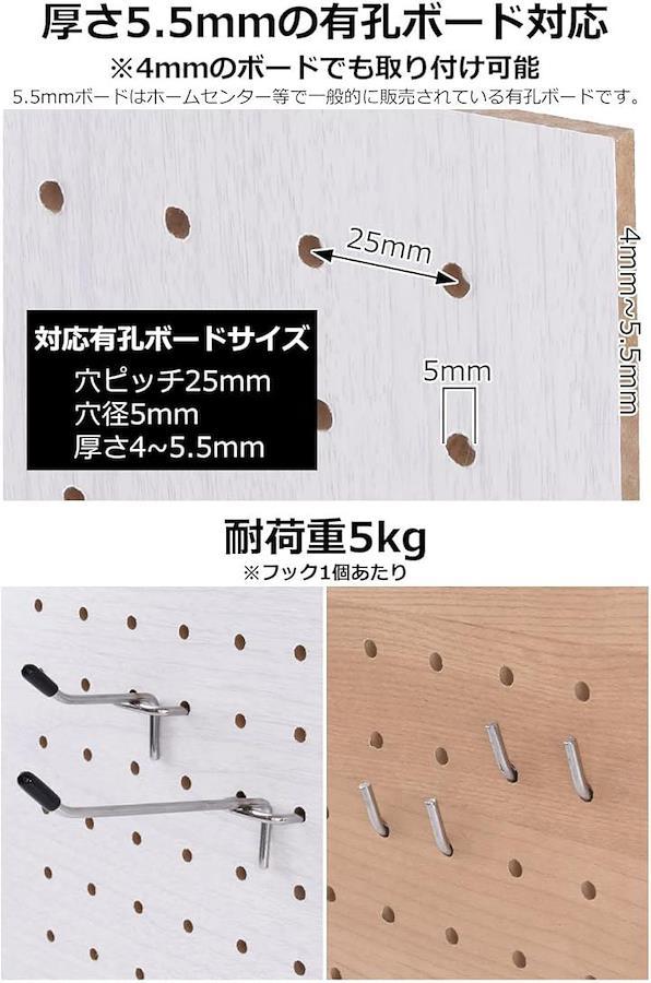 「ボードの厚さ5.5mm対応版」パンチングボード用フックはホームセンター等で一般的に販売されている厚さ5.5mm、ピッチ25mmの有孔ボードに対応したフックになります。