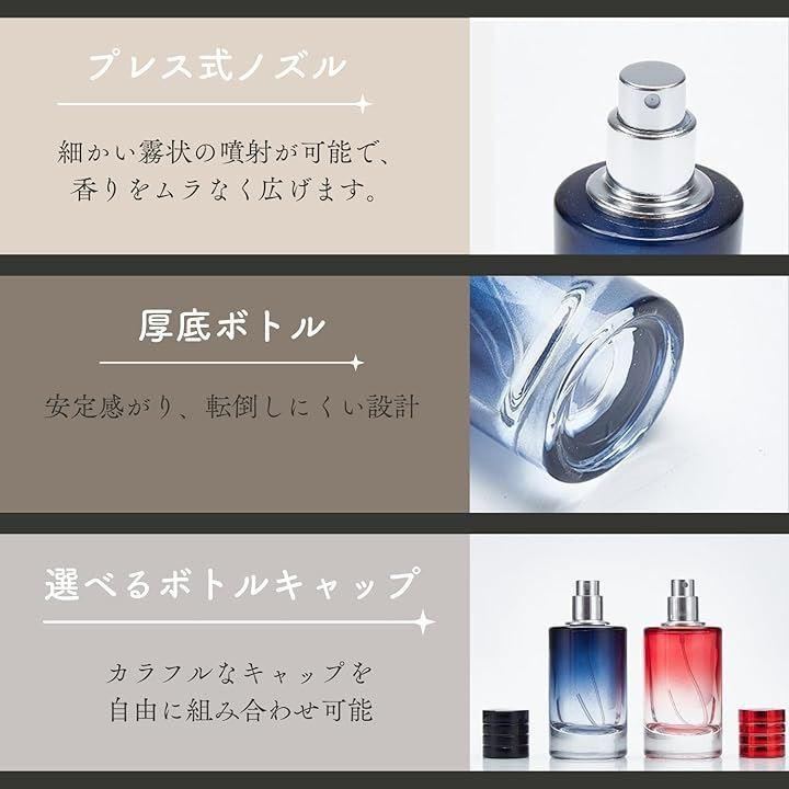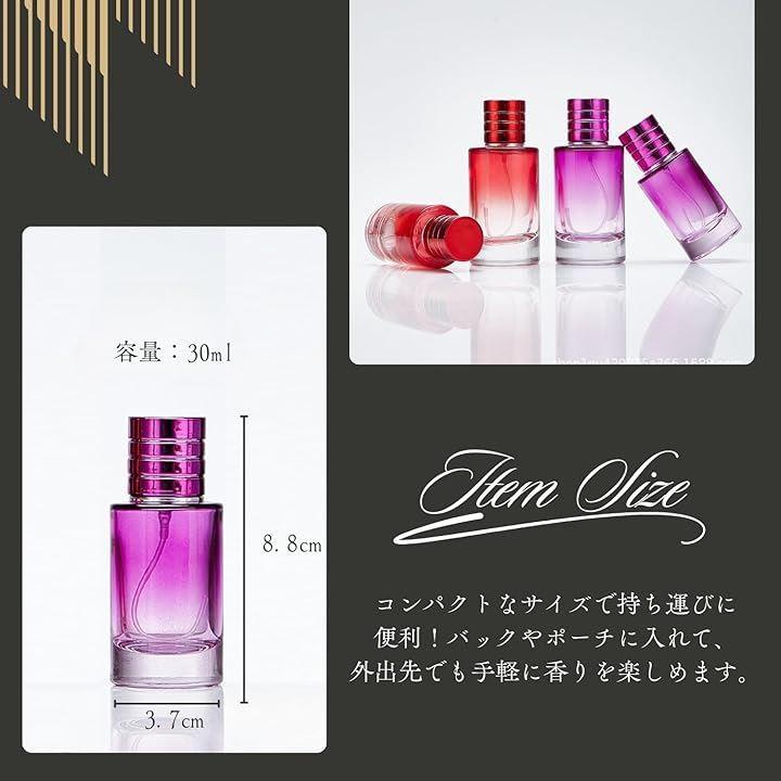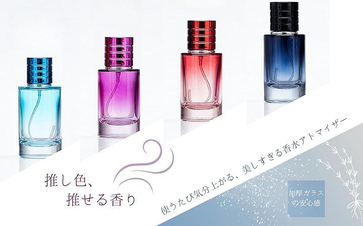 「セット内容」アトマイザー2本セット 「容量」各30ml 「カラー」ダークブルー レッド クリアブルー パープル(グラデーションガラス仕様) 「素材」ガラス(ボトル部) プラスチック・金属(スプレー部) 「用途」香水 化粧水 ヘアスプレー アルコール携帯用容器
