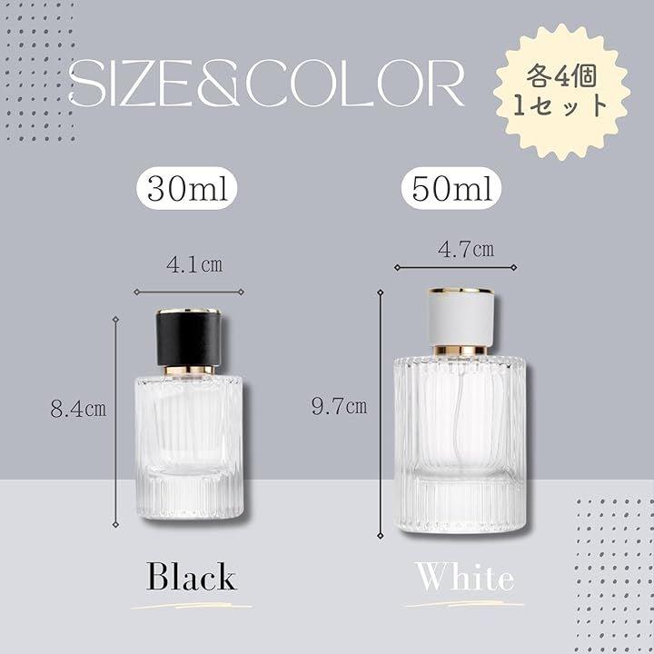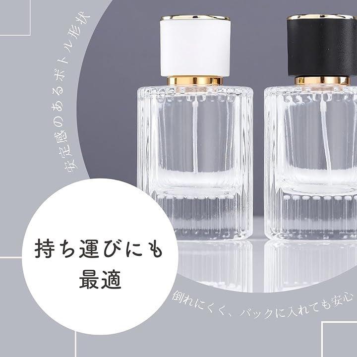 容量:30mL / 50mL 材質:ガラス カラー:ブラック / ホワイト 特徴:携帯便利 高密閉設計 漏れ防止 透明ボトル 耐久性あり 用途:香水 化粧水 ヘアスプレー アルコール対応