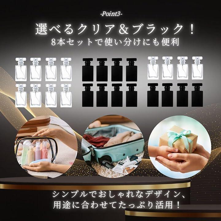 香水ボトルは2カラー&お得な8本セット:クリアとブラックの2色セットでスタイリッシュなデザイン。