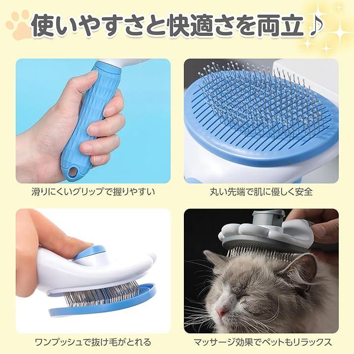 このペット用ブラシは、猫や犬の長毛・短毛に対応し、毎日のブラッシングを快適にします。