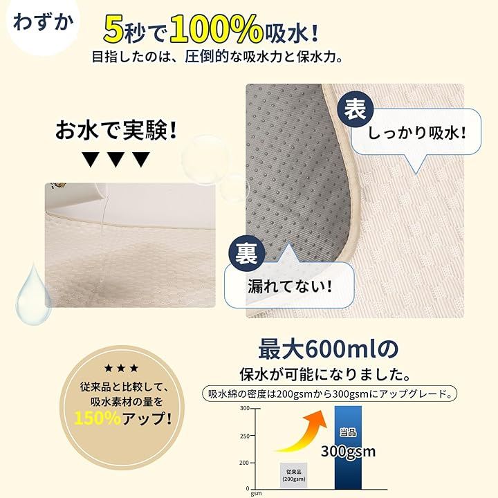 吸水層・防水層・抗菌層・冷却層を融合した独自設計で、1回の吸水で最大600mlを瞬時に吸収。