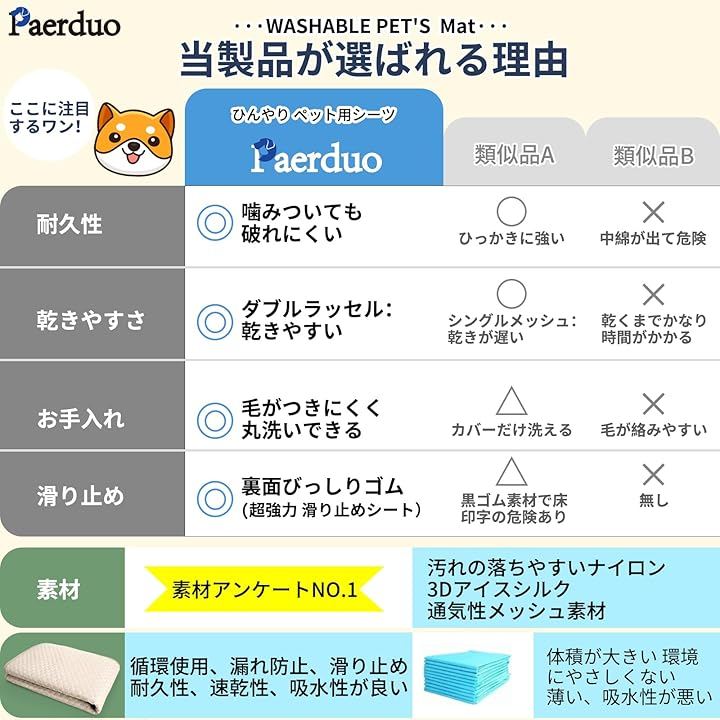 市場のほとんどの製品よりも厚く設計されたpaerduoペット用冷却マットは、熱中症対策グッズとして、老犬・子猫から大型犬までの体温を2~3℃低下させる効果が計測データで確認されています。