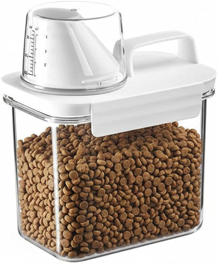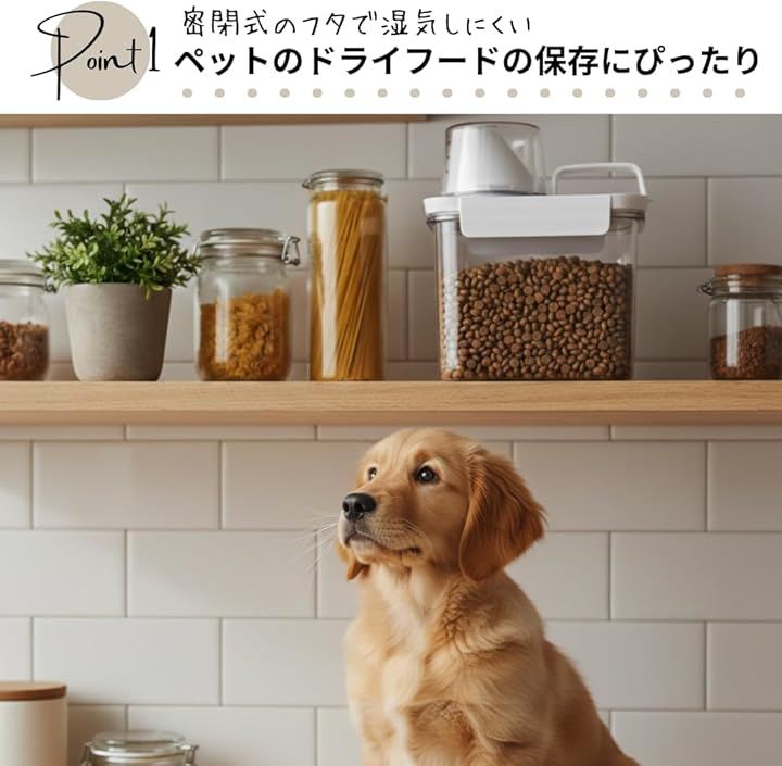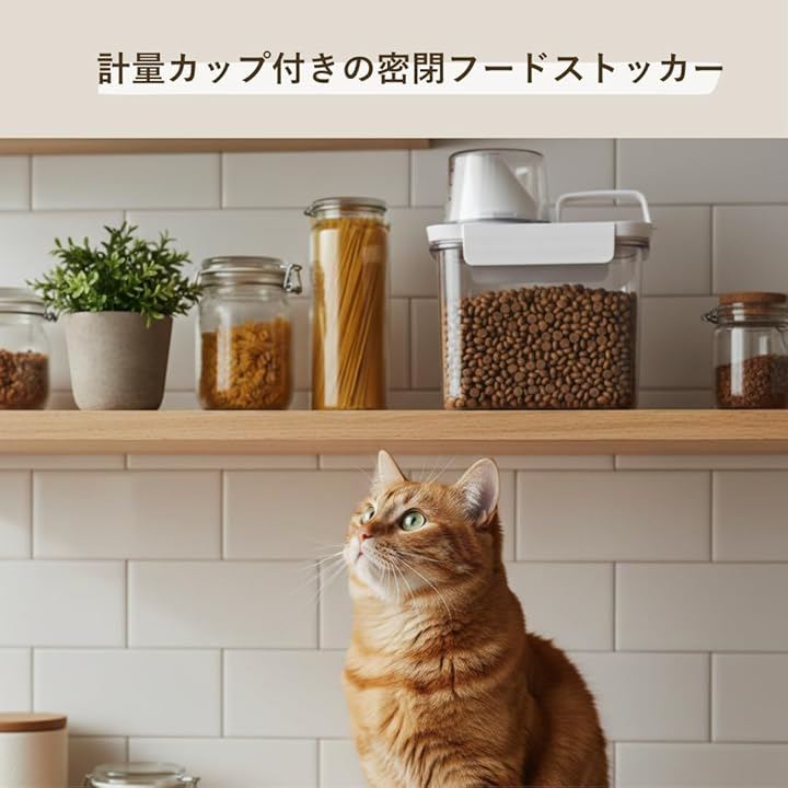 「計量カップ付きで使いやすさ抜群。ペットフードも湿気知らず」ペットのドライフード保存用にぴったりな密閉フードストッカー。