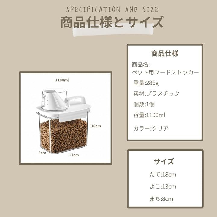 「商品内容」商品名:ペット用フードストッカー 重量:286g 素材:プラスチック 個数:1個 容量:1100ml カラー:クリア サイズ:縦18cm 横13cm まち8cm*蓋は回し開けてください。