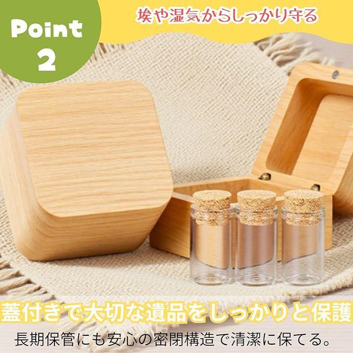 「多種類を分けて保管できるビン3本付き」本体の中に小さなガラスビンが3本セットされているため、遺骨、遺毛、乳歯、爪といった複数の形見を種類ごとに分けて大切に保管できます。