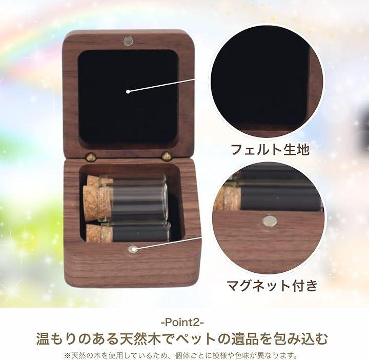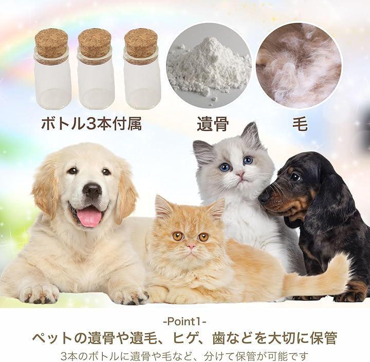 3本のボトル付きで、遺骨や遺毛、歯、骨、ヒゲ、爪など、遺品を分けて保存することができます。