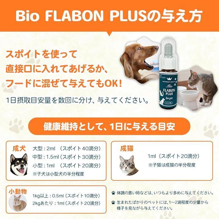 「1日に与える目安」大型犬 2ml / 中型犬 1.5ml / 小型犬1ml / 成猫 1ml / 小動物 1kgあたり0.5ml *スポイト1滴あたり0.05mlです 「使い方」ドライフードやおやつに混ぜたり、スポイトを使って直接口に入れてあげてください。