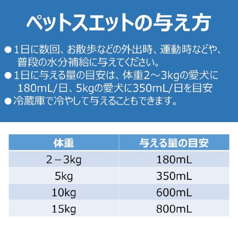 ・ペットの体液に近いイオンバランス、水分・イオンを素早く吸収・皮ふ・被毛の健康維持をサポートするパンテトン酸カルシウム配合。・オリゴ糖(ラクトスクロース)がお腹の環境を健康に保つ。・愛犬・愛猫の喜ぶヨーグルト風味。・愛犬・愛猫用栄養補完食<こんなときに・・・>・普段の飲み水として・水分が足りないと感じたときに・お散歩などの外出時、運動時に・暑いときに