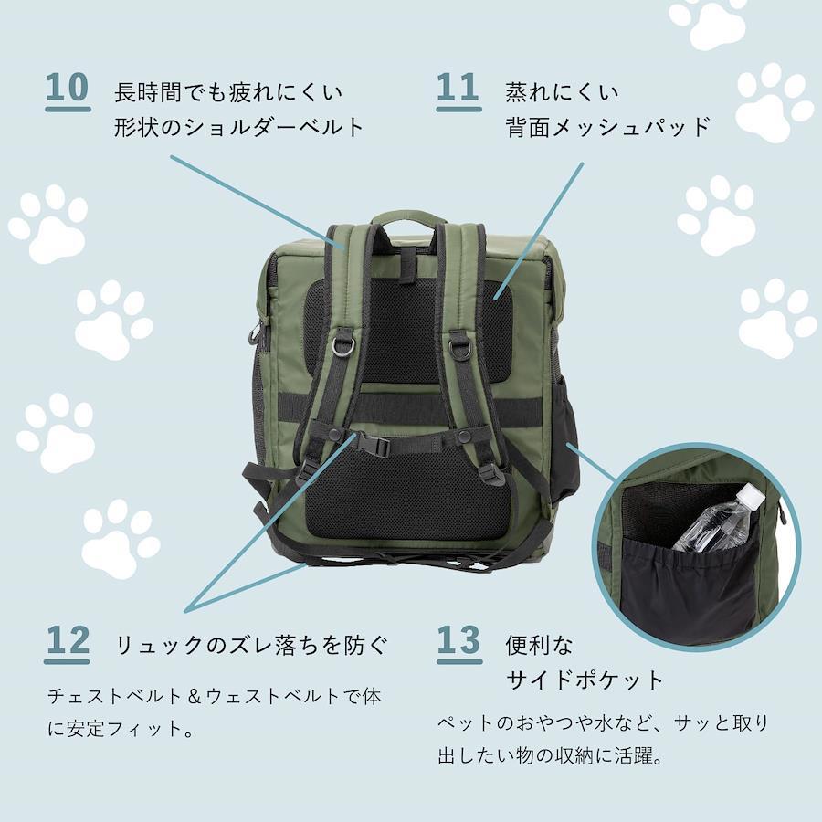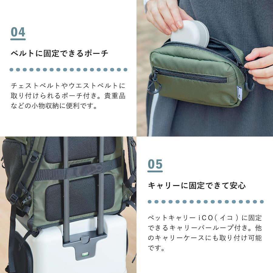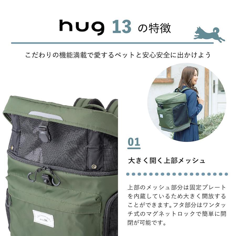 【快適なペット用リュック】体重5kgまでの超小型犬、小型犬とのお出かけ用ペットリュック。しっかりしているのに1,2kgと軽量【通気性抜群】両サイドがメッシュ仕様で通気性抜群。素材にもこだわって安定した乗り心地 【上部のふたが大きく開く】上部のふたを大きく開くとメッシュ部分に固定プレートがありしっかりとホールドしたままにできます。【飼い主さんが疲れない】ショルダーベルトは厚みがあり長時間でも疲れにくく、背面部分は蒸れにくいメッシュパッド仕様で快適です。【ICOにドッキング】ペットキャリーICOに固定できるキャリーバーループを装備しています。もちろん他のスーツケースにも装着できます。【大容量ポケット付き】お菓子やペットボトルなどを入れられる大容量のポケット付き。【便利なウエストポーチ】お菓子や携帯電話などを入れておけるウエストポーチがついているので、hugひとつでお出かけできます。