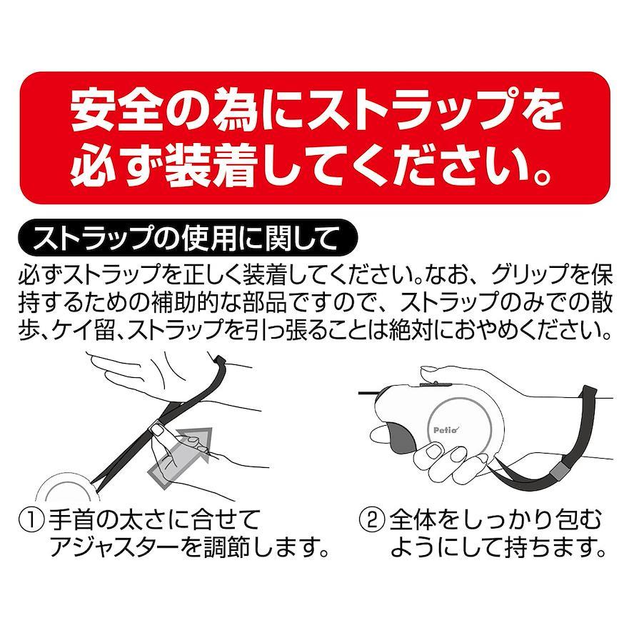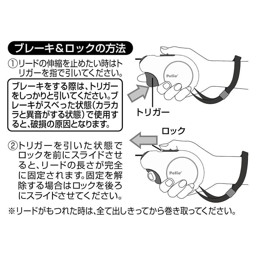 〈ブレーキ&ロックの方〉①リードの伸縮を止めたい時はトリガーを指で引いてください。ブレーキをする際は、トリガーをしっかりと引いてください。ブレーキがスベった状態(カラカラと異音がする状態)で使用すると、破損の原因となります。②トリガーを引いた状態でロックを前にスライドさせると、リードの長さが完全に固定されます。固定を解除する場合はロックを後ろにスライドさせてください。※リードがもつれた時は、全て出しきってから巻き取ってください。