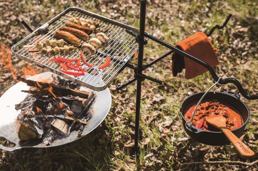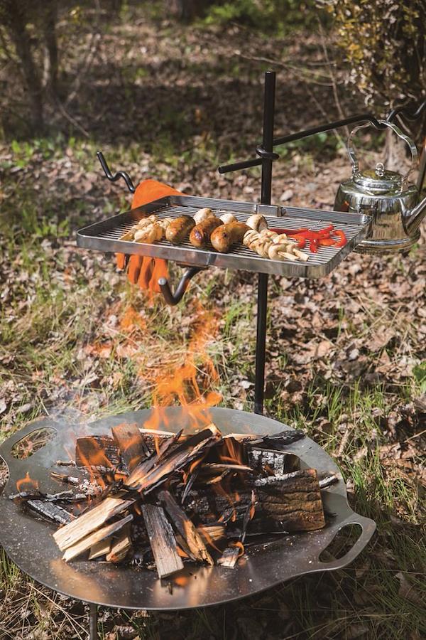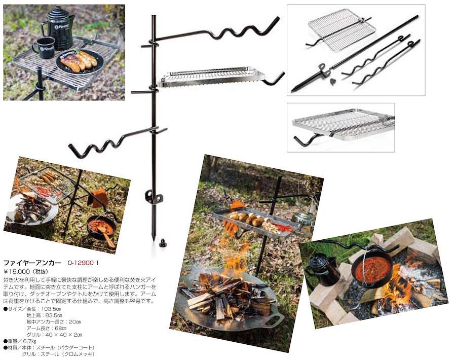 ファイヤーアンカーは、キャンプファイヤーや焚火台で多目的に使うことができるアンカーです。高さ調整が可能なアームにはパーコレーターやダッチオーブン(最大ft6-t)を吊り下げることができます。グリルではステーキやソーセージ、野菜を焼いてBBQをお楽しみください。