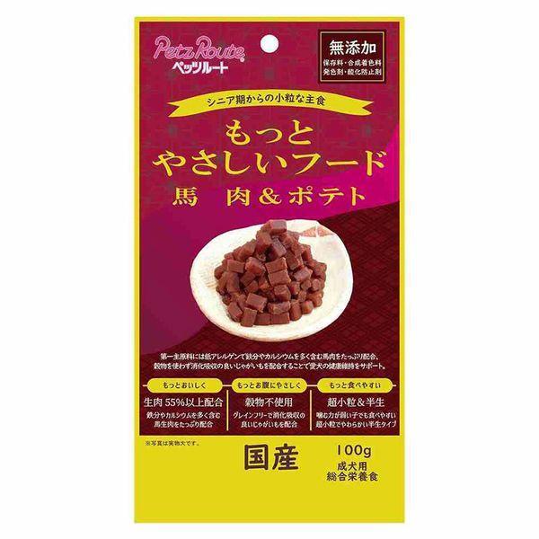 ペッツルート 4984937684051 もっとやさしいフード 馬肉&ポテト 100g馬肉と鶏肉を配合したシニア犬向けの国産プレミアムフード食欲減退や運動量の変化など、シニア期から栄養バランスに最適な主食を目指した「国産のスーパープレミアムフード」です。