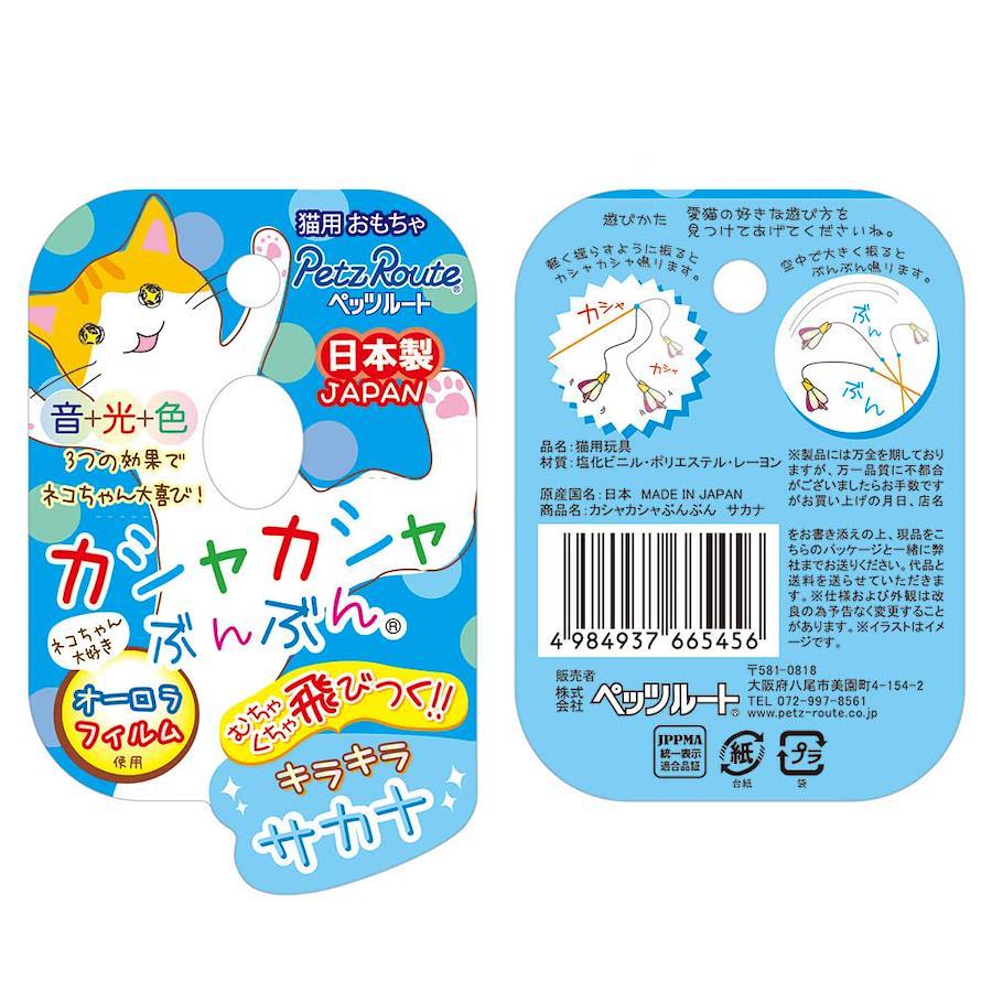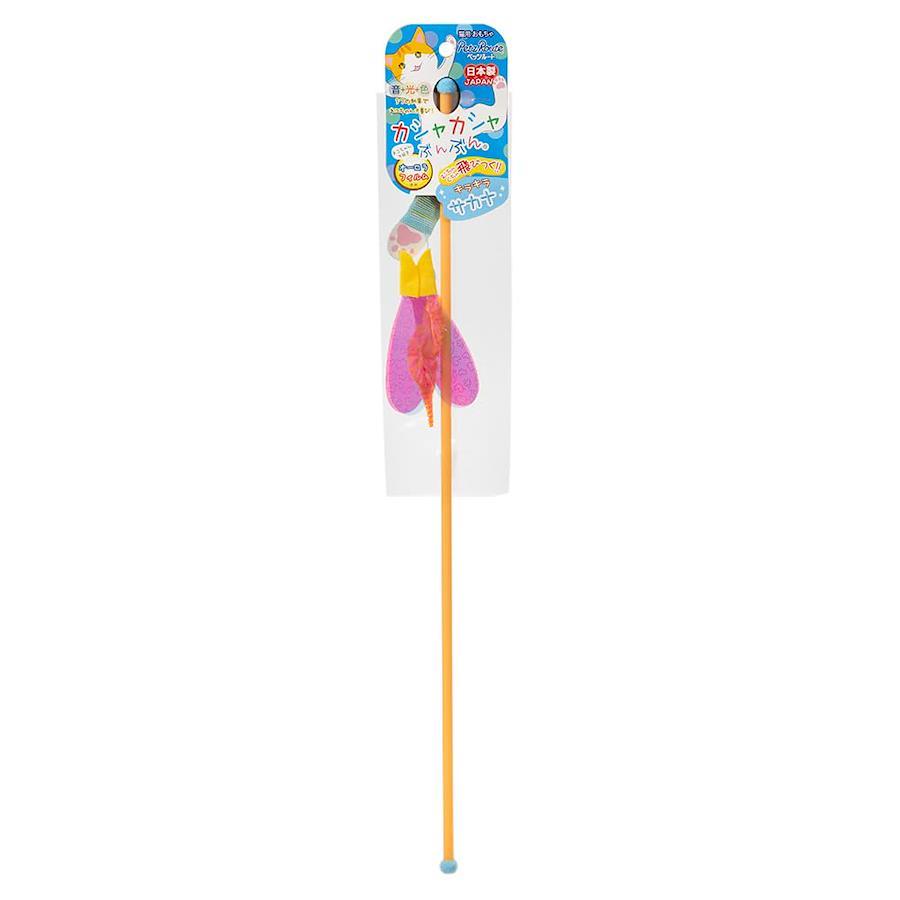 カシャカシャと鳴る羽音が狩猟本能を刺激します。 棒を大きく振るとサカナのモチーフがぶんぶんと振動します。