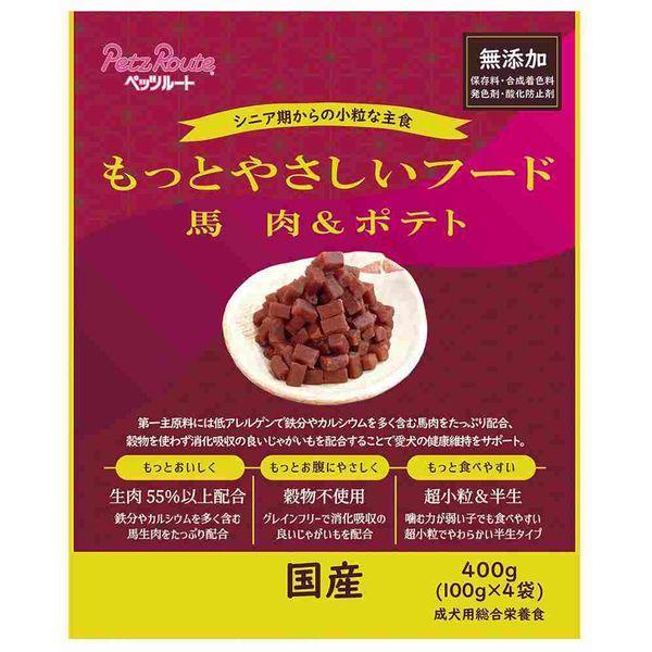 ペッツルート 4984937683795 もっとやさしいフード 馬肉&ポテト 400g馬肉と鶏肉を配合したシニア犬向けの国産プレミアムフード食欲減退や運動量の変化など、シニア期から栄養バランスに最適な主食を目指した「国産のスーパープレミアムフード」です。